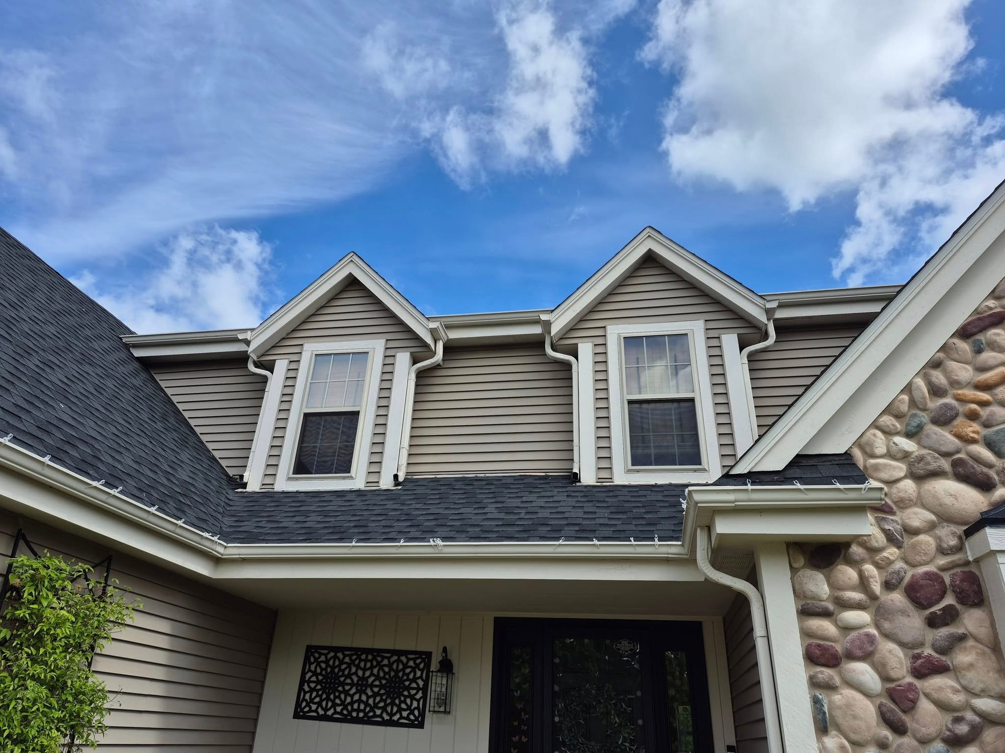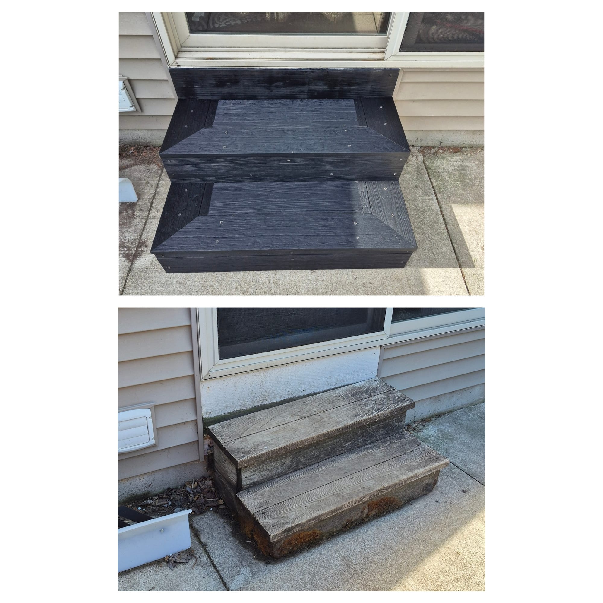 We breathed new life into this Muskego home by restoring and replacing deteriorated cedar trim. From the garage door to the bay window and second-floor windows, we installed durable PVC and LP Smartside trim, followed by a fresh coat of paint to match. We even built a custom step using black composite decking to seamlessly blend with their existing fence! This project ensures years of beauty and curb appeal.