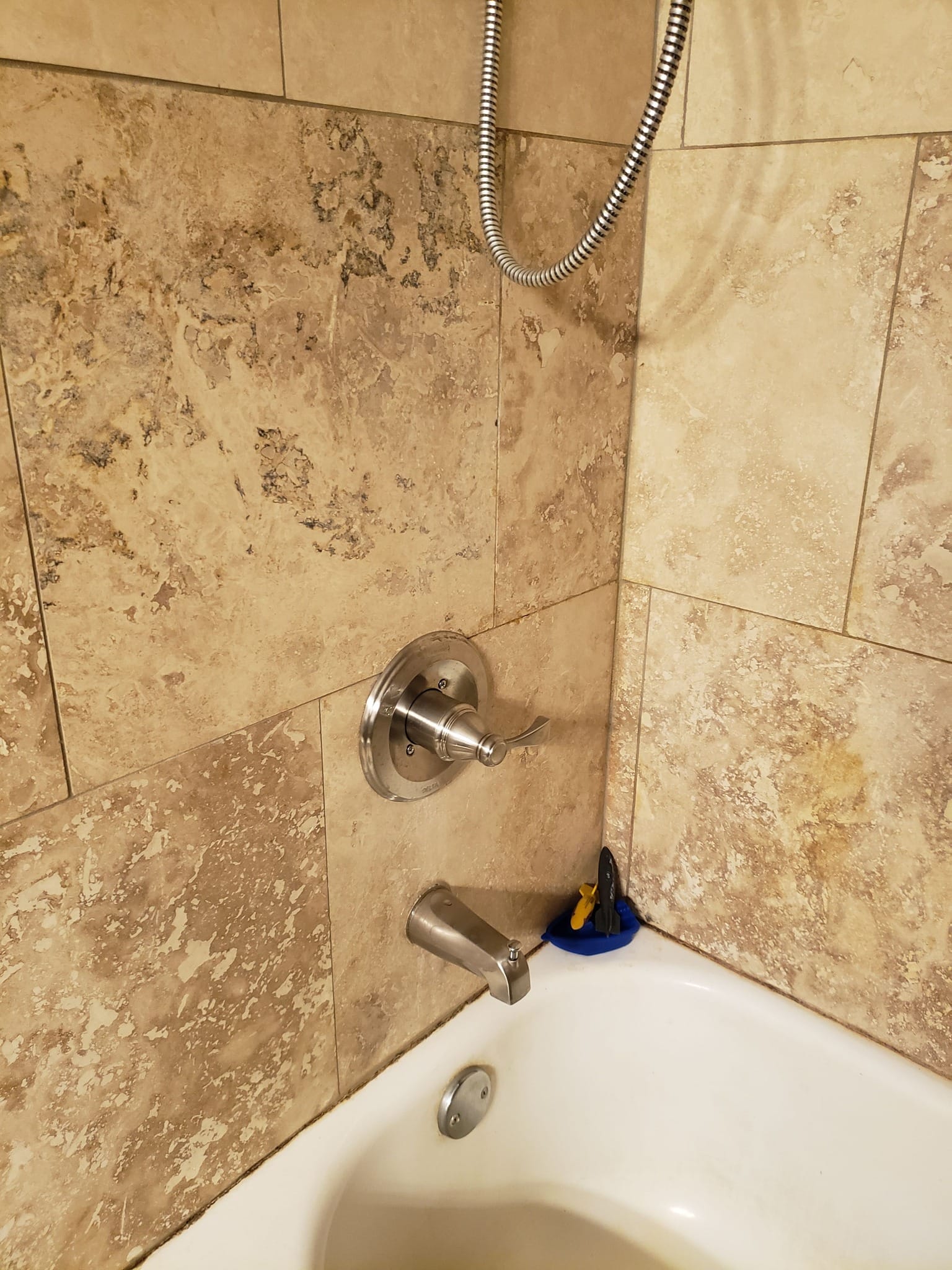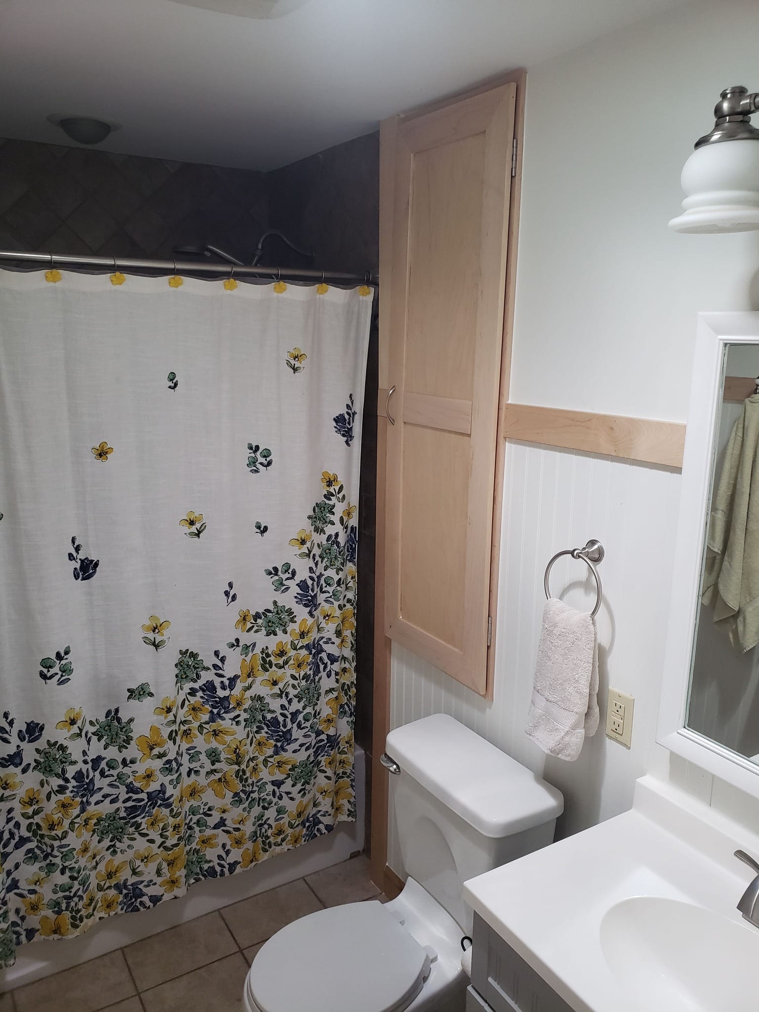 Beyond the cosmetic updates, we also addressed practical concerns, repairing a problematic toilet and installing a new shower trim kit. We added convenient finishing touches like a floating shelf and towel ring to enhance usability and comfort.