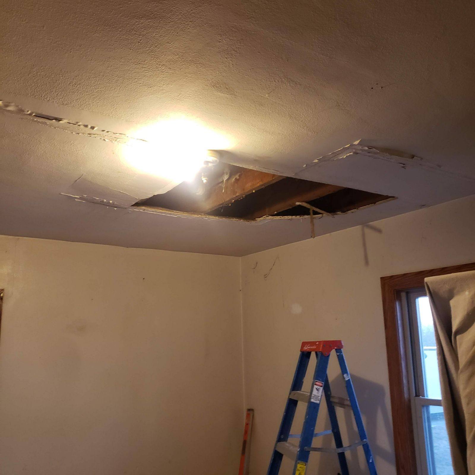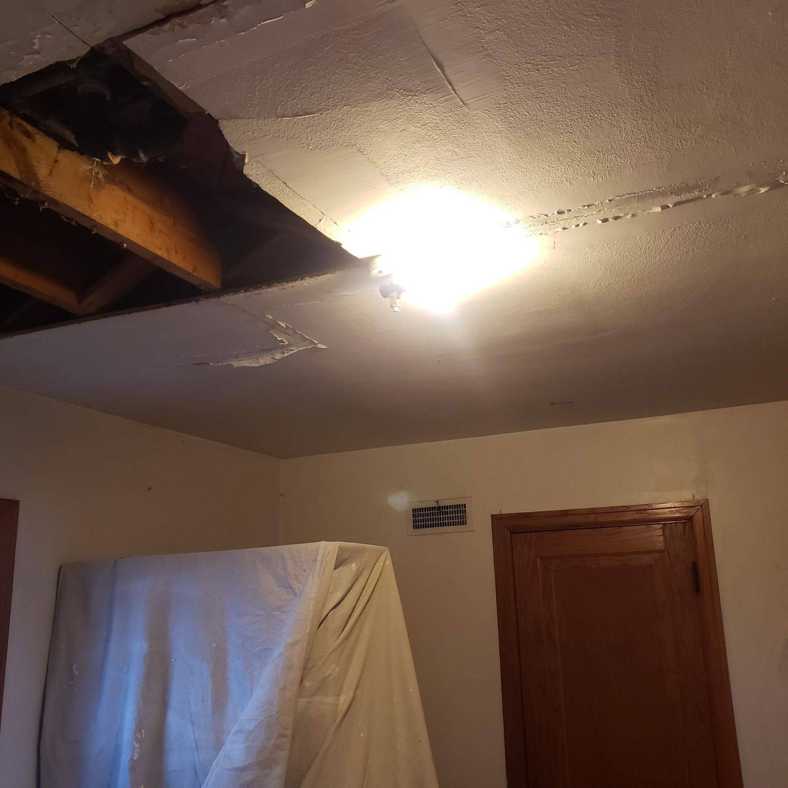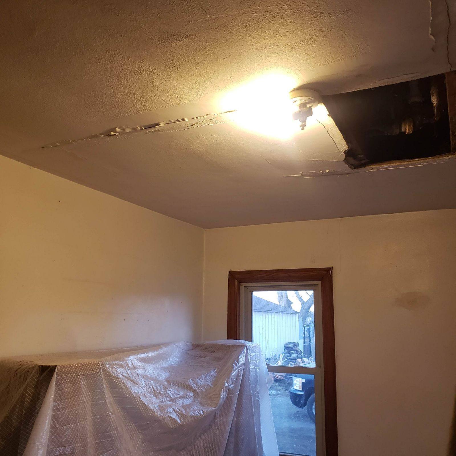 We recently restored a room ceiling severely damaged by a water leak. Our team removed the damaged plaster, identified and resolved the source of the leak (a faulty drain), and expertly installed new drywall, expertly primed and textured to match the existing surface.