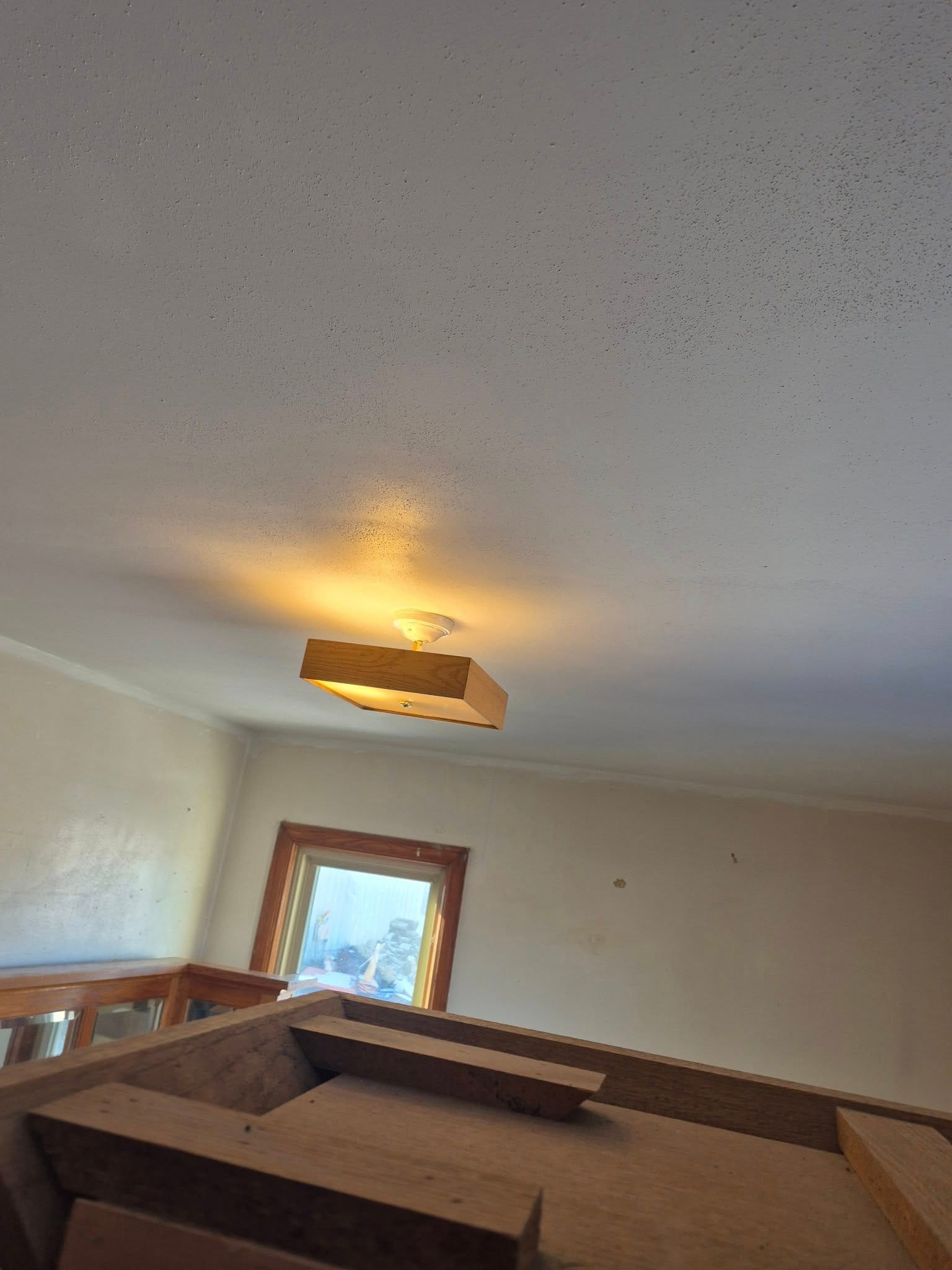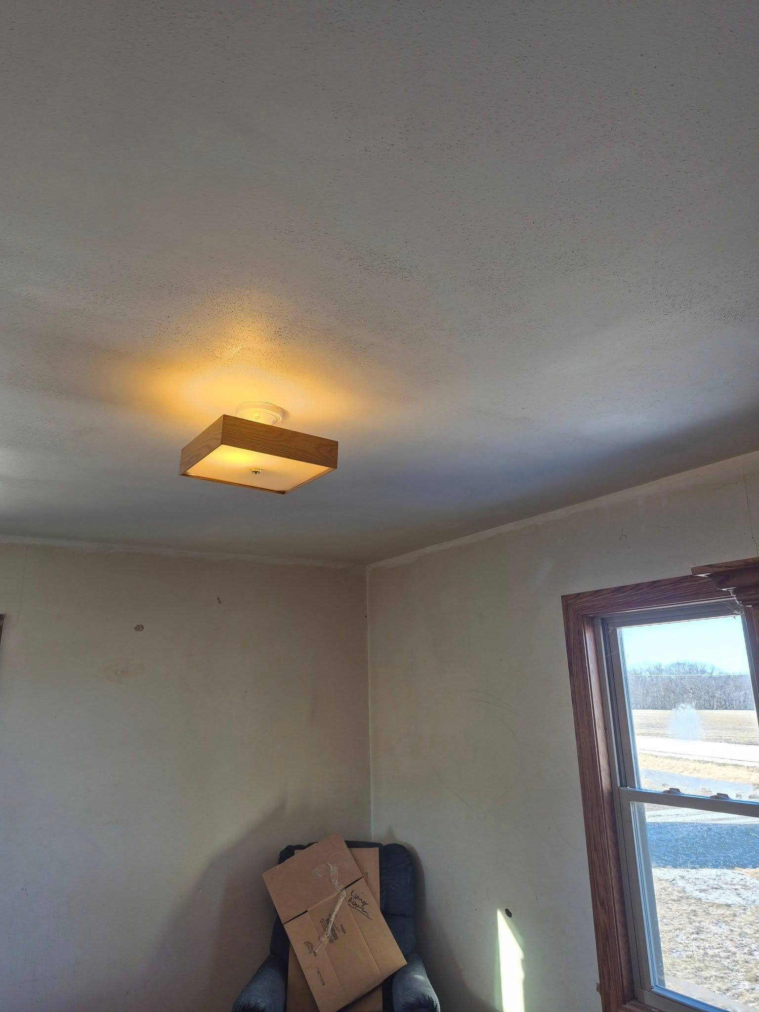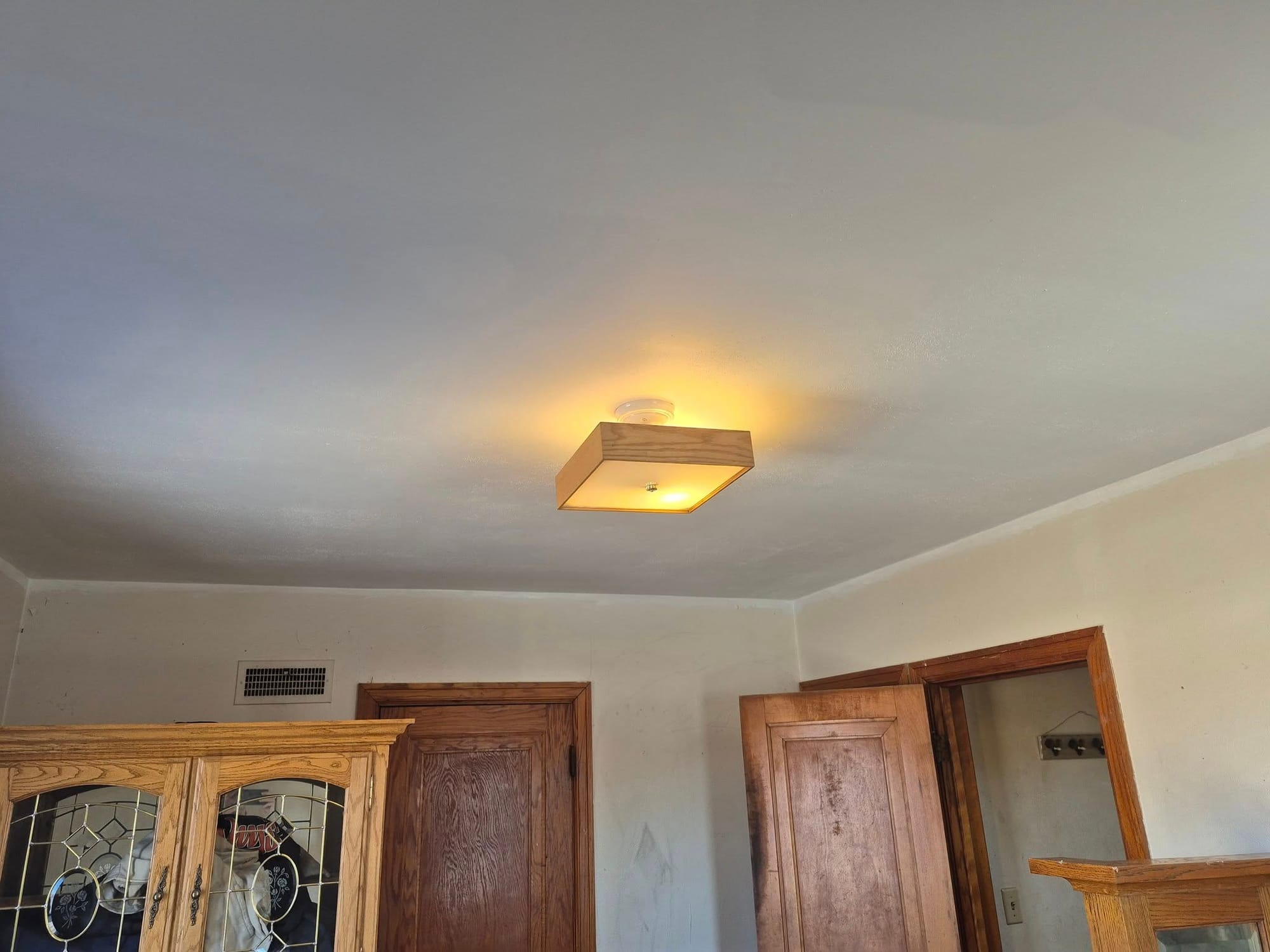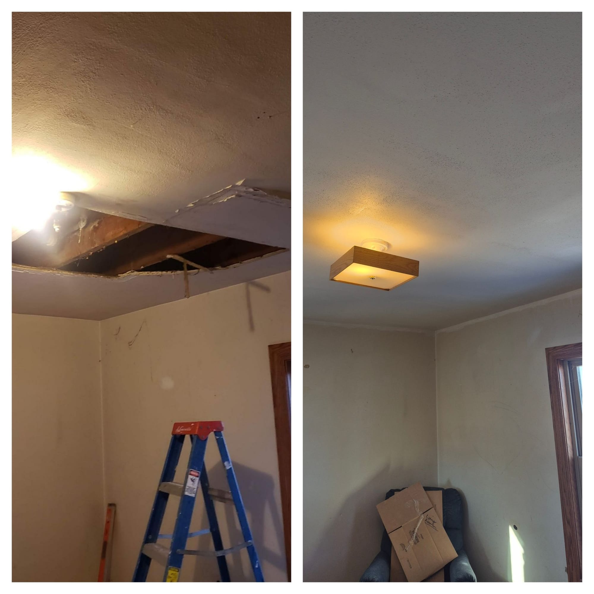 We recently restored a room ceiling severely damaged by a water leak. Our team removed the damaged plaster, identified and resolved the source of the leak (a faulty drain), and expertly installed new drywall, expertly primed and textured to match the existing surface.